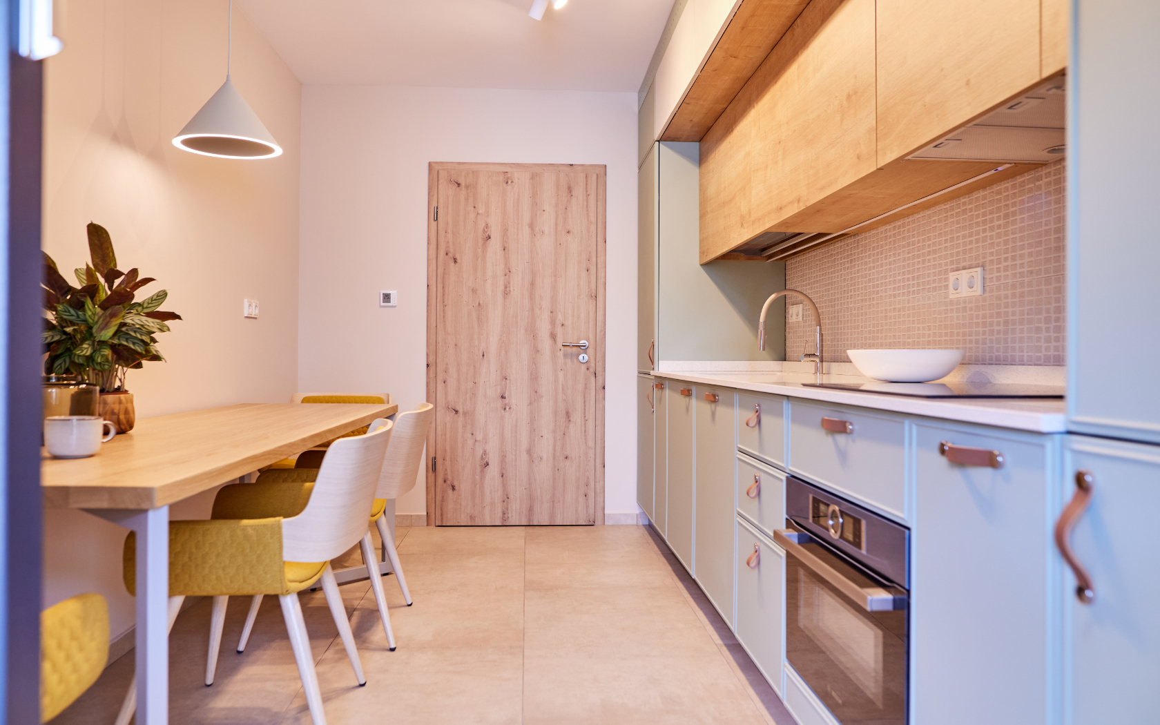 Bucătăria este inima oricărui cămin, iar în acest apartament, am reușit să creăm un spațiu unde gătitul devine o plăcere. Amenajată în nuanțe calde și materiale naturale, bucătăria emană o atmosferă primitoare și practică. Fiecare detaliu, de la mobilierul liniar până la vitrină și masă, a fost realizat cu măiestrie și pasiune.