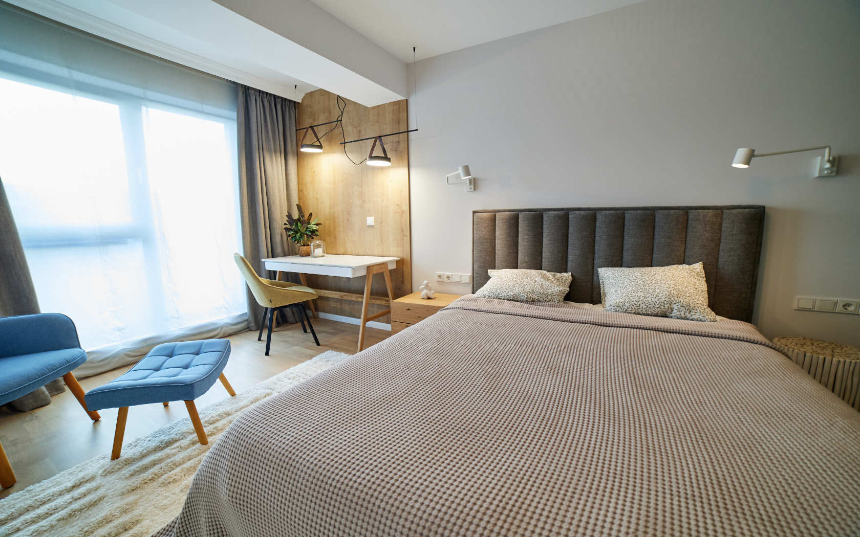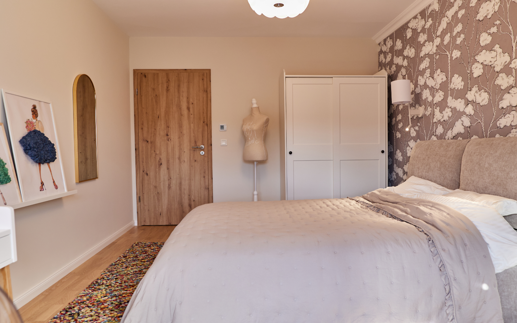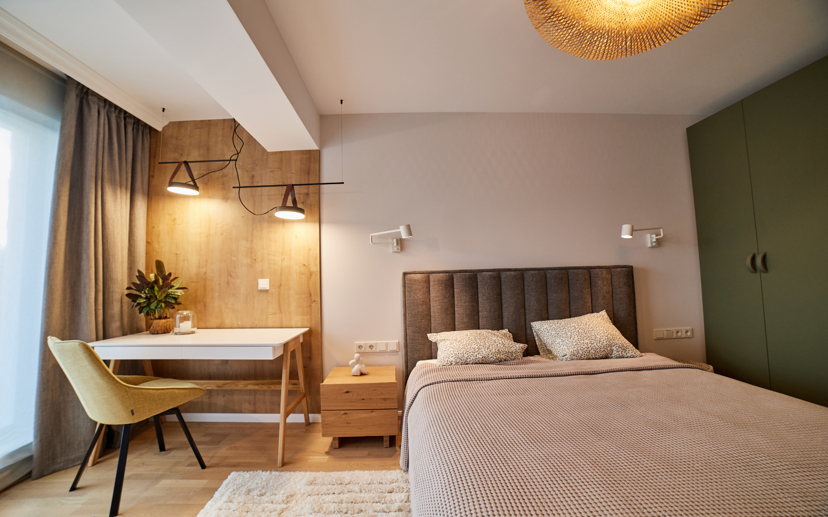 Dormitorul de oaspeți este un exemplu elocvent al atmosferei de relaxare pe care am dorit să o creăm. Culorile calde și accentele naturale aduc o senzație de zen, transformând acest spațiu dintr-un loc banal într-o oază autentică de odihnă.